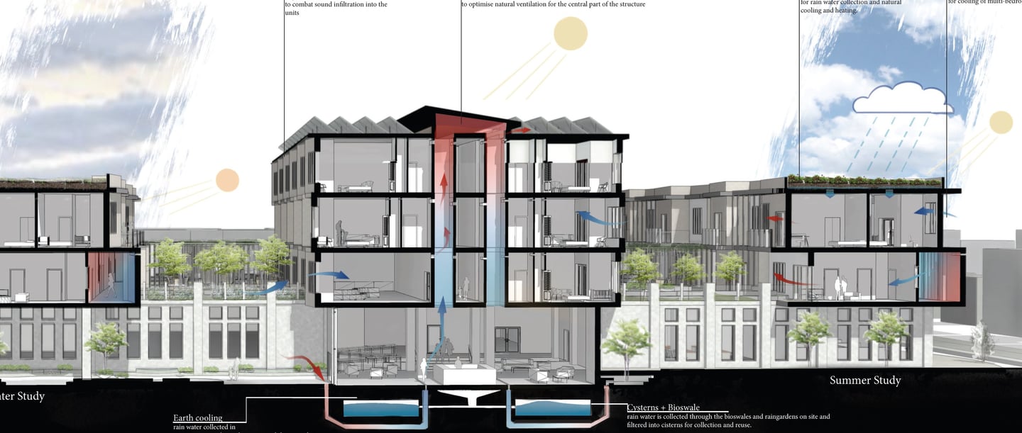 Evara is a multifamily housing complex meant to welcome individuals and families alike who are in need of support and guidance during a rough time in their lives. This project is designed to work with families, mothers, fathers and students in need. Different backgrounds, circumstances and requirements congregate into one space to form something new, a fellowship. Similar to the makings of a nest, the design is based on the interwoven pieces that form the structure for the inhabitants. In Evara, the pieces are the units, knitted together to provide privacy as well as facilitate community spaces. Starting from the ground up the varying stages of community thrive; the further you rise the more independent you may become. Just like the wind used in the solar chimney , the occupants experience a sense of sanctuary, freedom and flight, as they ascend; beginning their journey with confidence and ease as they push forth on their individual paths