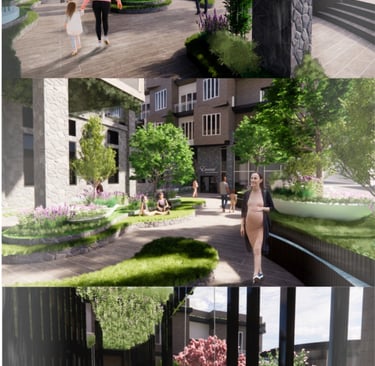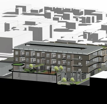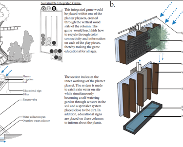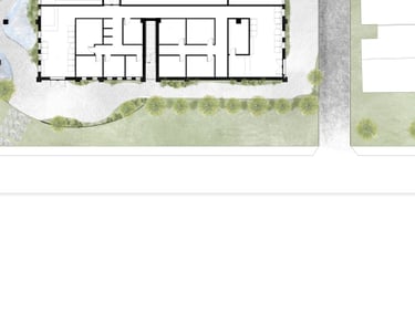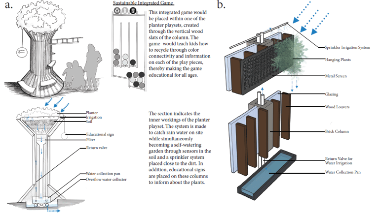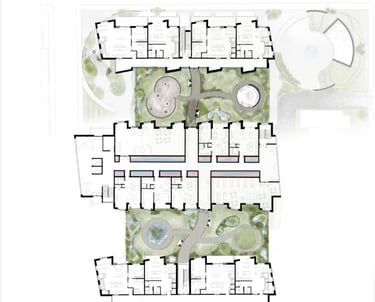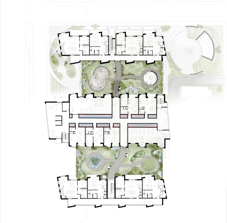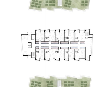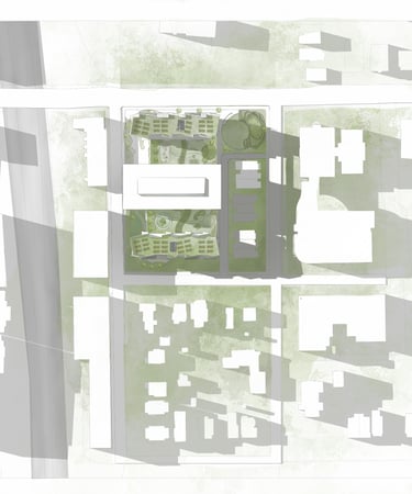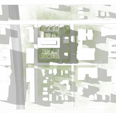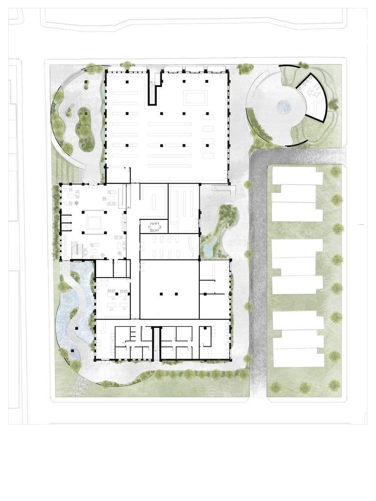 The ground floor includes a supermarket, thrift store, doctor's office, dry cleaners, chapel and storage space for the residents. As an added edition an outdoor theater/ cafe is included on the corner by the school, so that parents may wait for their kids as they drop them off and leave.