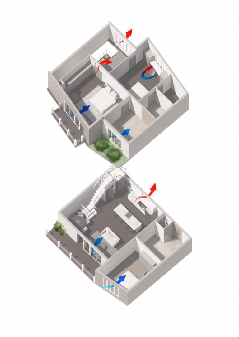 Achieve natural ventilation through the solar chimney and operatable windows.