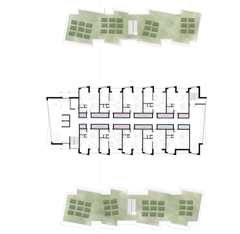 The top level holds more single bedroom and studio units along with green roofs where residents can maintain their own gardening plots.