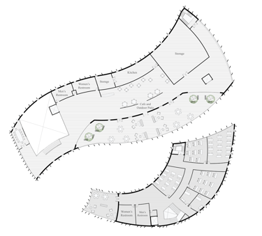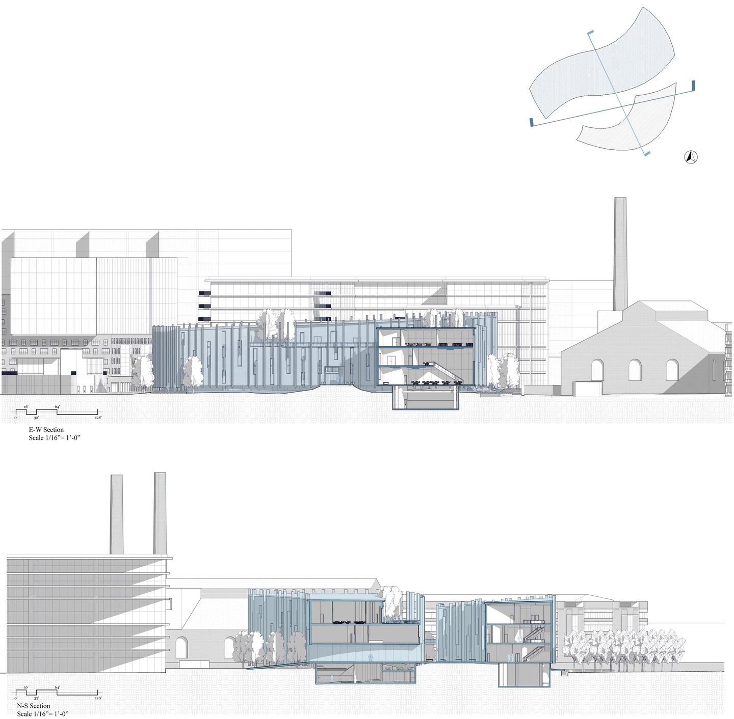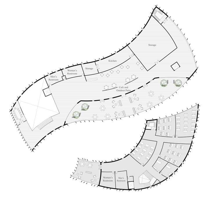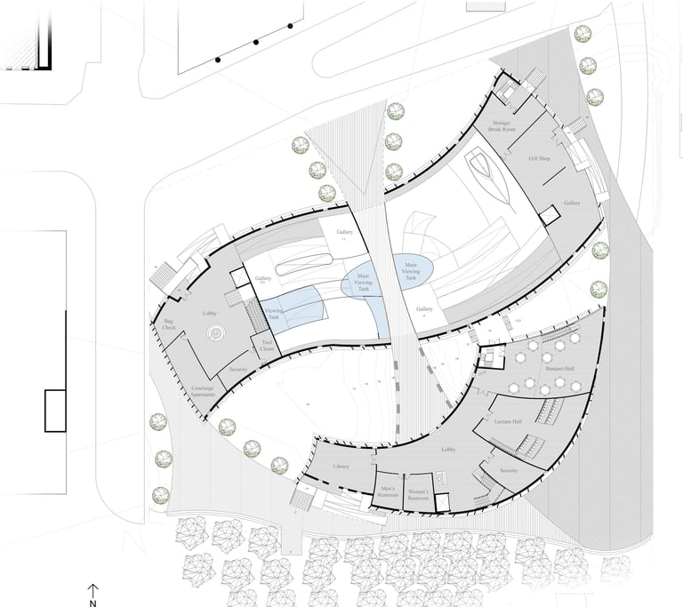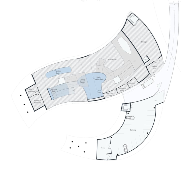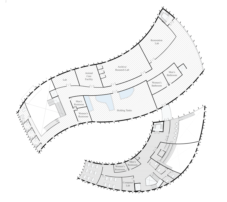 Set in the navy yards park, banking the river’s edge, the project presented was to design a maritime museum, aquarium and academy. In response to the large and demanding program, I set out to separate the academy and the museum. To do this I took inspiration from the curving nature of whales and the tide and set out to create a campus that fully encapsulated the maritime nature of the building. The primary feature of the program was the gallery spaces of the museum, incorporated with the viewing tanks. To experience the gallery, the user is taken through a journey of time and nature, slowly descending to the basement level of the museum. Th ere they encounter a forest of aquatic spaces that transport them through the water until they emerge to see the show stopping ships. Th e design was made to be completely ADA compliant so that anyone can have the